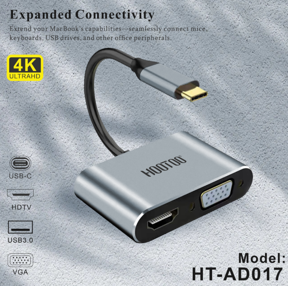 استمتع بالوضوح مع محول HooToo HT-AD017 الذي يوفّر لك تحويل منفذ USB-C إلى HDMI وVGA بسهولة وجودة عالية.
